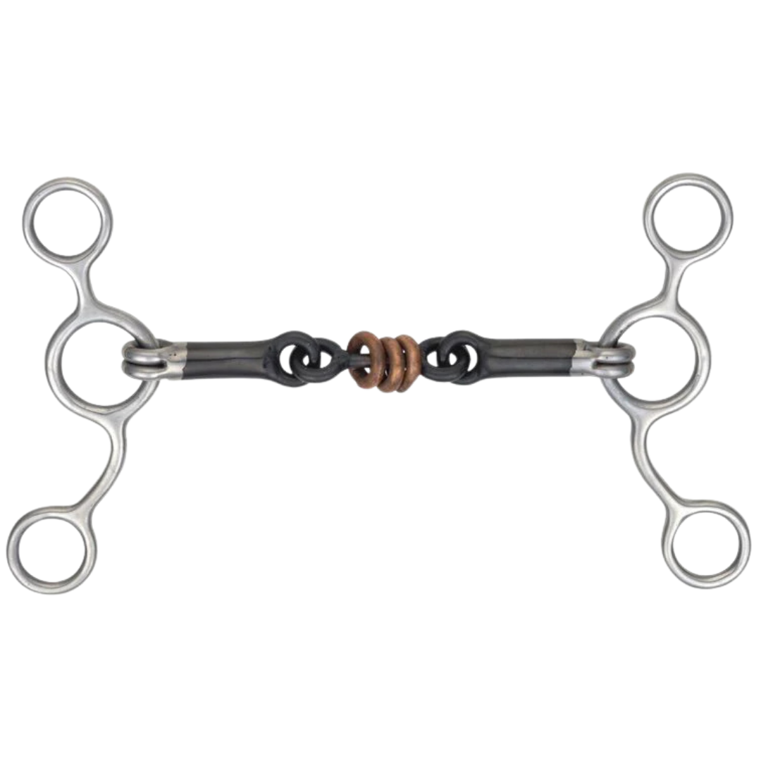 The sweet iron and copper combination in this tom thumb bit help to promote salivation and encourage softening. The cheeks give this bit a lever action. The raised copper rollers can help to prevent the horse taking too much of a hold. Mouthpiece thickness: 14mm. Cheek height: 140mm. Sweet iron mouthpieces are designed to oxidize to produce a sweet taste which helps with mouthing. The addition of copper to the mouth ensures the horse will not take up too much of a contact, ideal for horses that can take a hold. Stainless steel is used for the cheeks due to it being durable, easy to clean and resistance to rust.