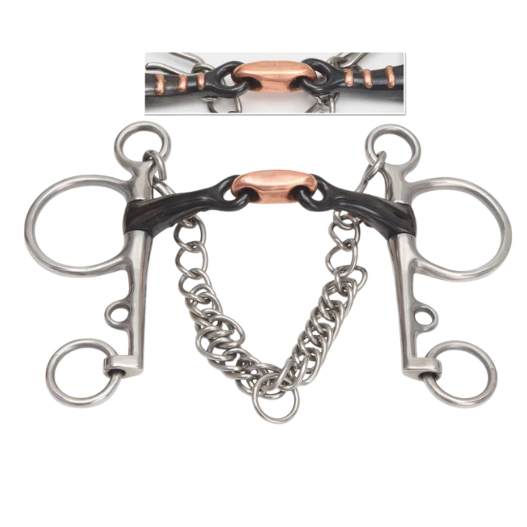 Pelhams work on the poll, corners, bars, tongue and chin groove. This bit will assist with control. The jointed mouthpiece will lessen the nutcracker action. The copper and sweet iron will encourage the horse to be softer in the mouth. Raised copper ribs help to prevent the horse taking too much of a hold. Mouthpiece thickness: 16mm. Cheek height: 135mm. Sweet iron mouthpieces are designed to oxidize to produce a sweet taste which helps with mouthing. The addition of copper to the mouth ensures the horse will not take up too much of a contact, ideal for horses that can take a hold. Stainless steel is used for the cheeks due to it being durable, easy to clean and resistance to rust.
