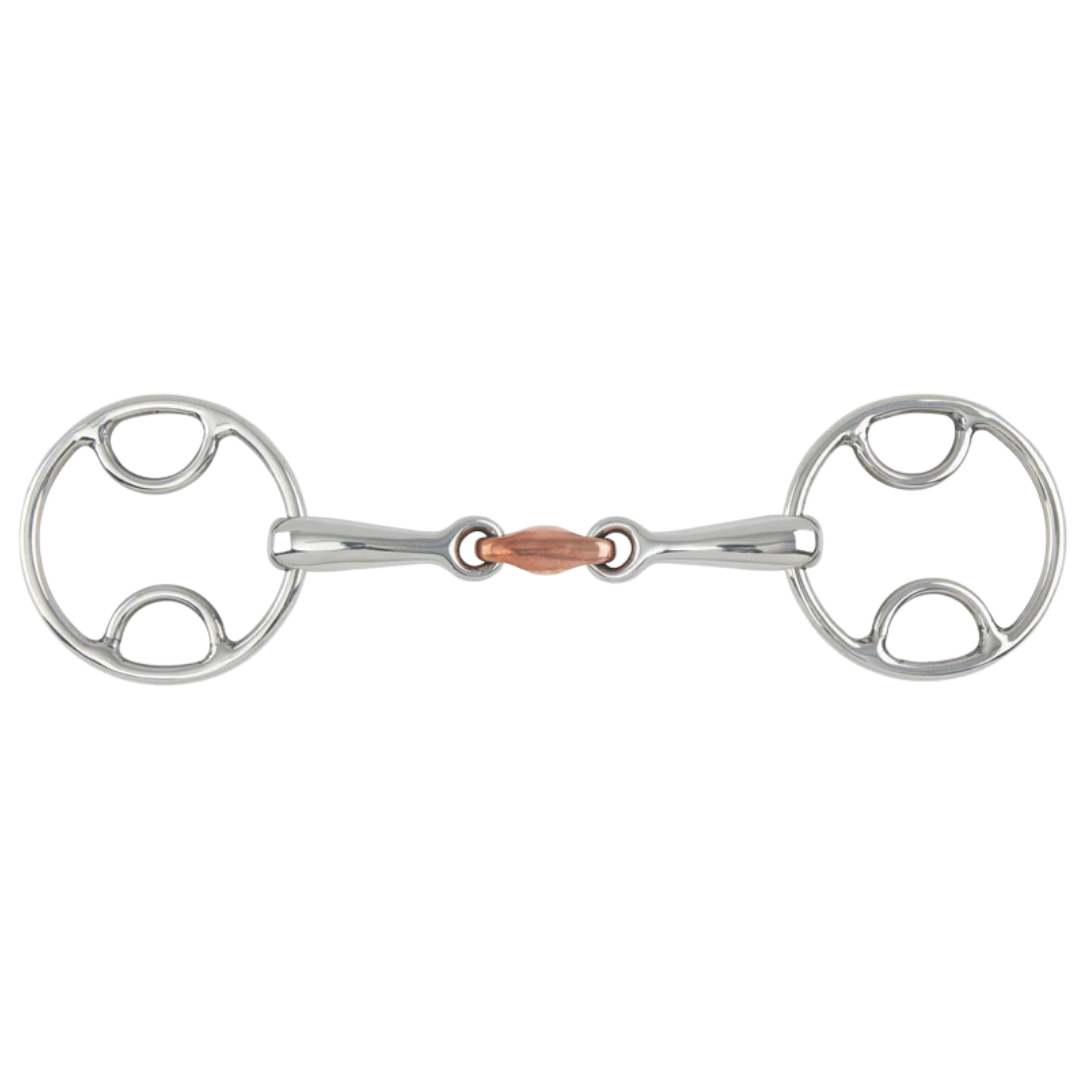 This bevel bit allows mild leverage. A copper lozenge assists with salivation. Mouthpiece thickness: 16mm. Cheek height: 55mm (4.5", 5"), 70mm (5.25", 5.5", 6"). Stainless steel is the most common material for bits. Durable, easy to clean, tasteless and does not rust. Copper is used in the mouthpiece, creating warmth and encouraging salivation to keep the mouth soft.