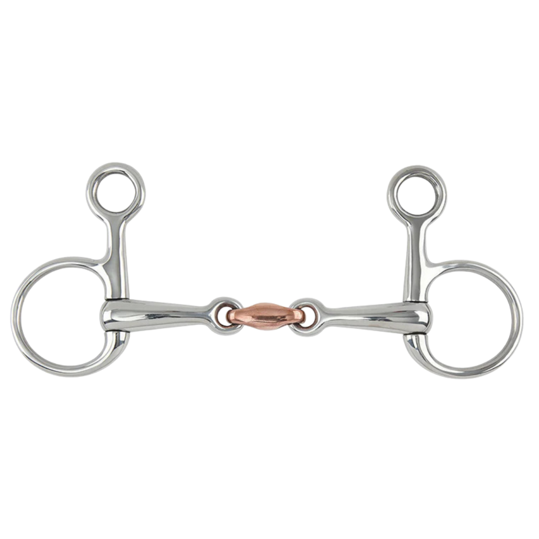 Hanging cheeks help to encourage flexion, whilst the copper lozenge prevents the nutcracker effect of a single joint and encourages salivation. Mouthpiece thickness: 16mm. Cheek height: 110mm. Stainless steel is the most common material for bits. Durable, easy to clean, tasteless and does not rust. Copper is used in the mouthpiece, creating warmth and encouraging salivation to keep the mouth soft.