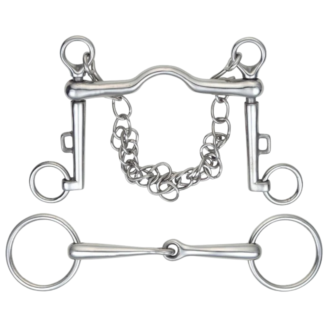 This full sized Weymouth set has a loose ring bradoon to allow more movement. Mouthpiece thickness: 14mm Weymouth/14mm Bradoon. Cheek height: 125mm Weymouth/55cm Bradoon. Stainless steel is the most common material for bits. Durable, easy to clean, tasteless and does not rust.