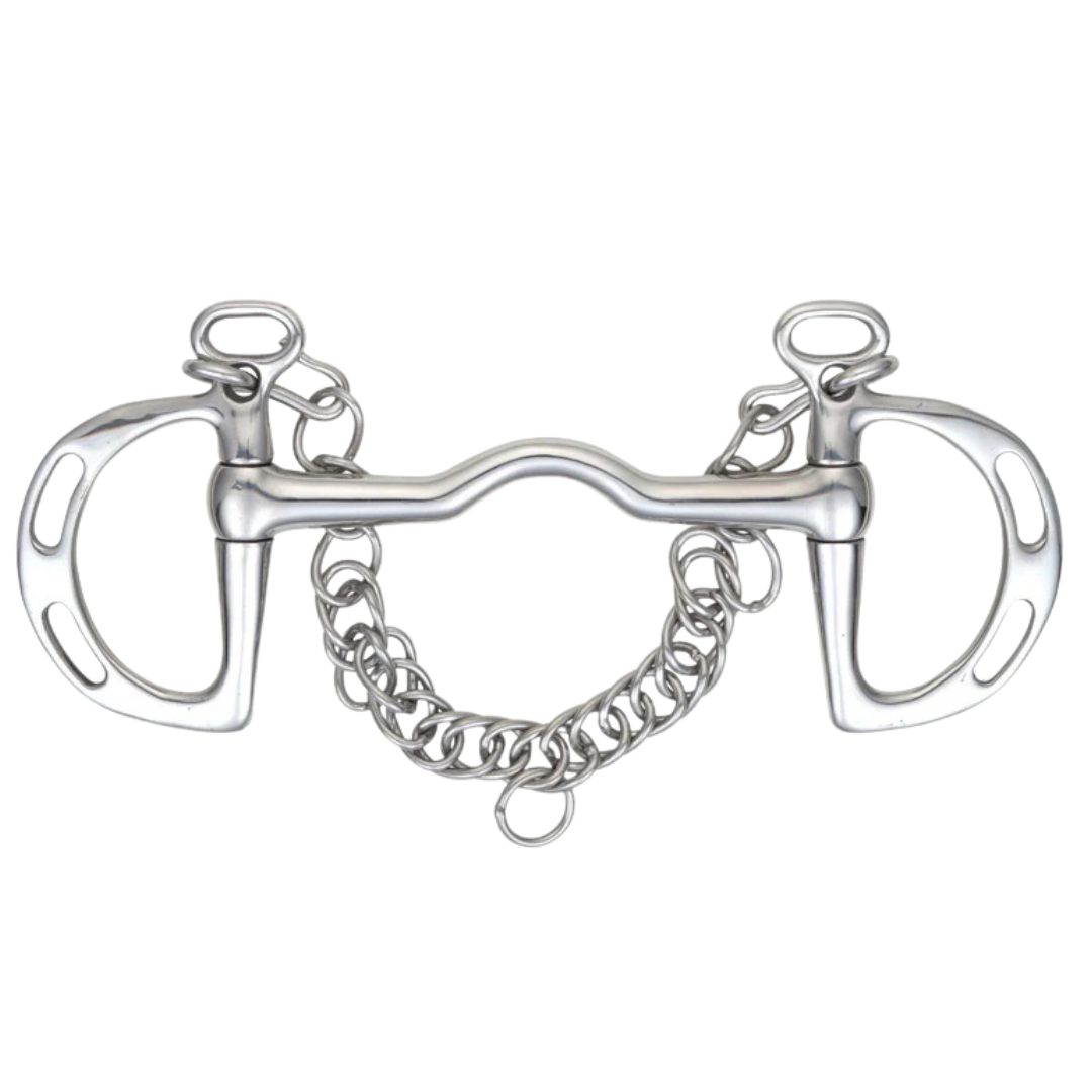 The port allows more room for the tongue, but will also apply pressure to the roof of the mouth. The slots in the D-rings allow for increased leverage on the poll. This bit should be used with care. Also known as a Uttoxeter Kimblewick. Mouthpiece thickness: 14mm. Cheek height: 100mm. Stainless steel is the most common material for bits. Durable, easy to clean, tasteless and does not rust.