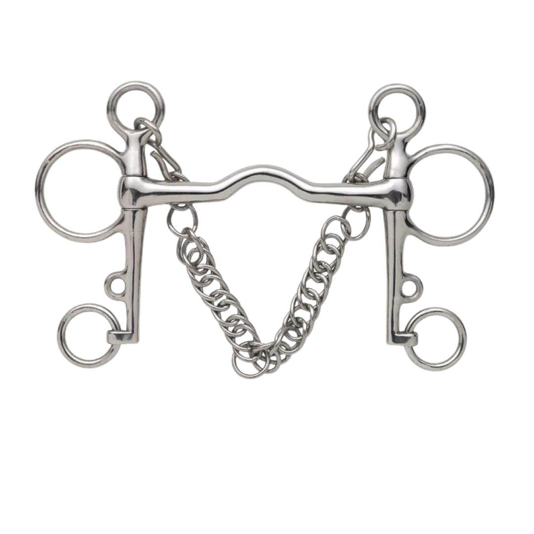 The port in this pelham creates more space for the horse's tongue. Can be used with double reins or pelham roundings. Mouthpiece thickness: 14mm. Cheek height: 130mm (4.5, 5), 140mm (5.5). Stainless steel is the most common material for bits. Durable, easy to clean, tasteless and does not rust.
