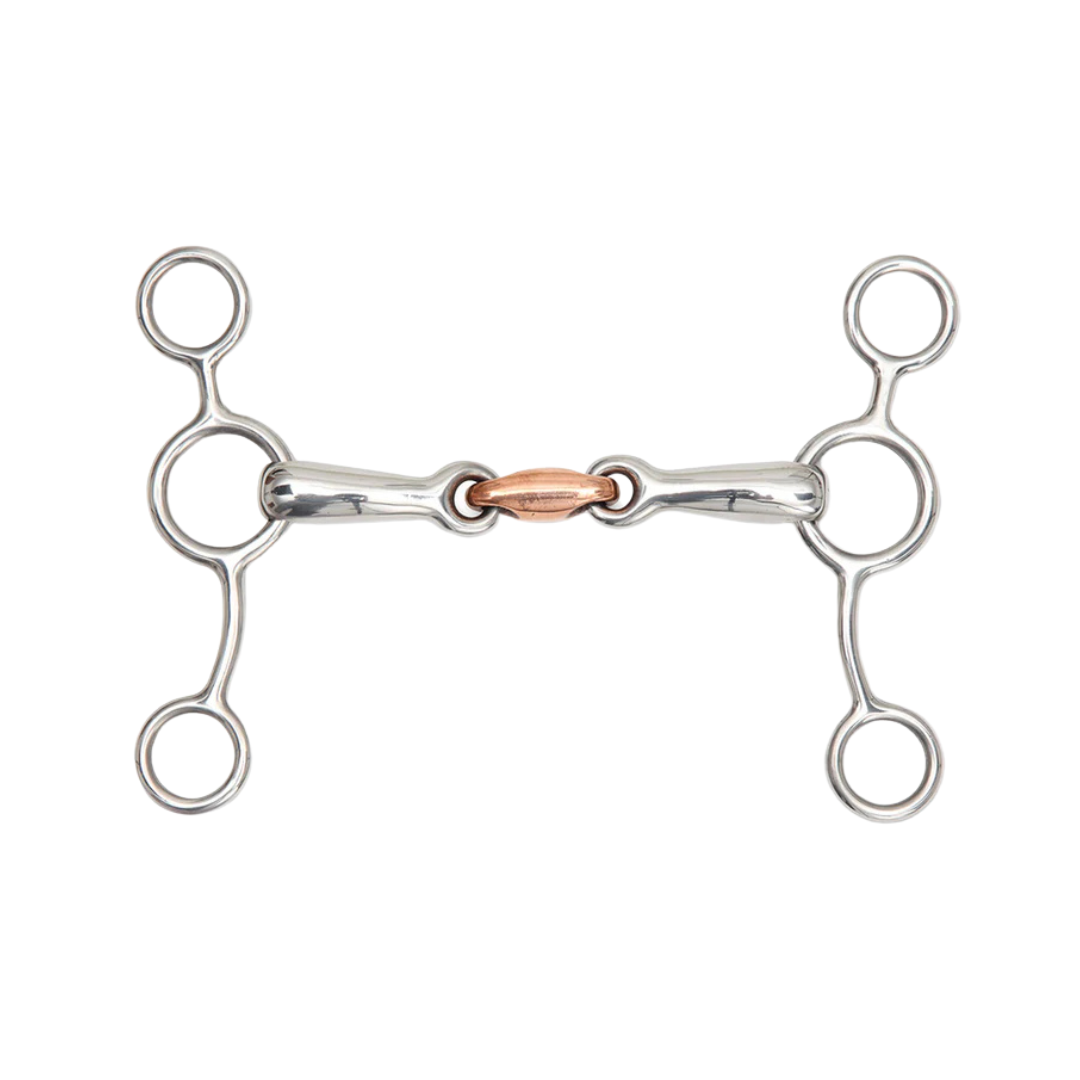 This bit works by putting pressure on the poll and the tongue. Attaching the reins to the lower rings will increase severity, it should be used with care. Mouthpiece thickness: 16mm. Cheek height: 135mm. Stainless steel is the most common material for bits. Durable, easy to clean, tasteless and does not rust. Copper is used in the mouthpiece, creating warmth and encouraging salivation to keep the mouth soft.