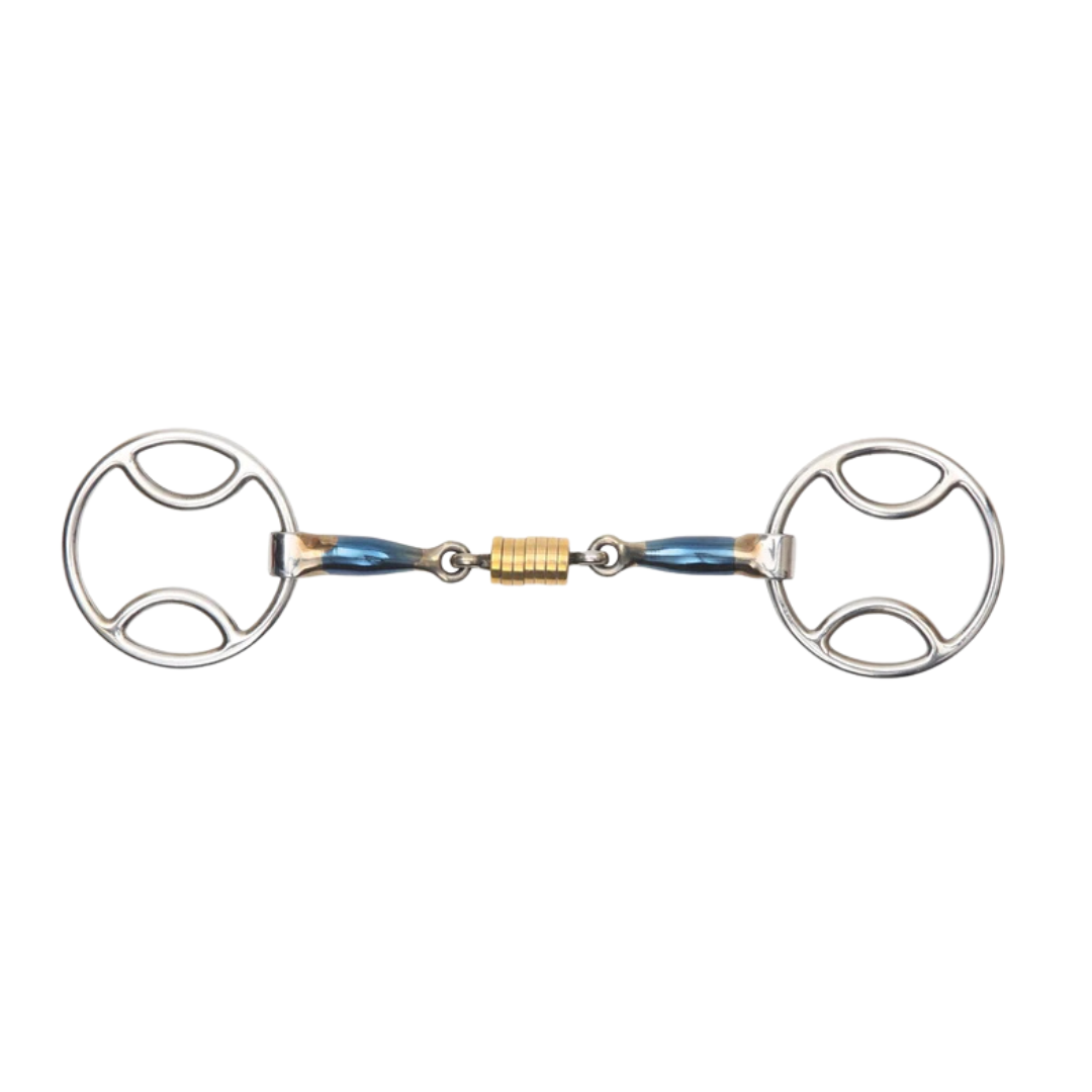 The bevel bit allows mild leverage and offers a little more control, promoting outline, head carriage and responsiveness. The loose brass alloy discs in the centre can help to soothe a fussy tongued horse. Mouthpiece thickness: 15mm. Cheek height: 55mm (4.5", 5"), 65mm (5.5"). Blue sweet iron mouthpieces oxidise easily to create warmth with a sweet taste which helps with bit acceptance and encourages salivation. Please note the blue colour will fade with use. The addition of brass alloy inserts produces a warm, more palatable bit. Stainless steel is used for the cheeks due to it being durable, easy to clean and resistance to rust.