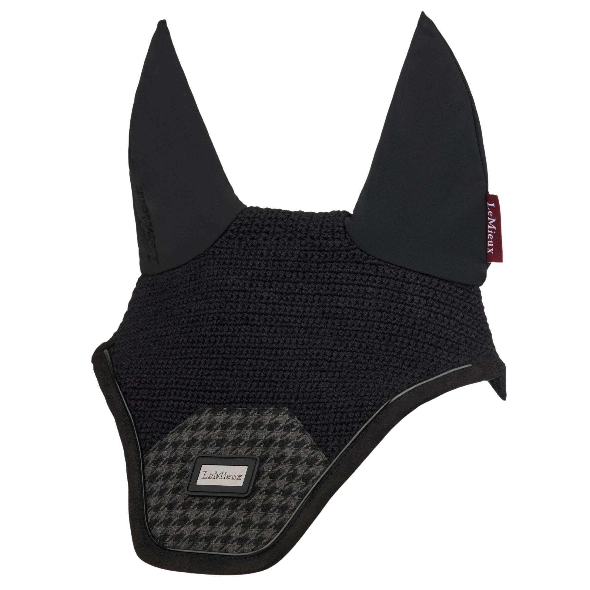 Enhance your Aspen Collection ensemble with this refined Fly Hood, highlighted by a matching herringbone-patterned front patch. Distinctive patent PU accents and a gunmetal badge harmonize with the Aspen range. The handmade crochet veil features a dense knit for a secure, snug fit beneath the bridle. Soft elastane ear panels shield your horse’s ears from flies, dust, and distractions, combining protection with comfort.