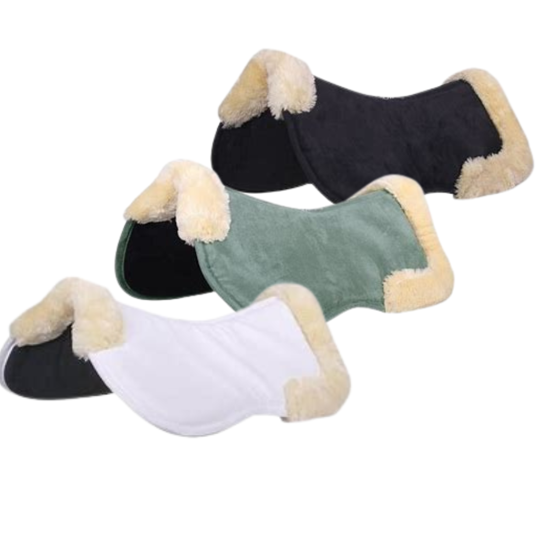 This half pad is filled with memory which shapes itself to the saddle and the horse’s back to provide an optimal fit, better pressure distribution and shock absorption. At the withers and along the rear an artificial fur border is placed. The suedine topside and fleece bottom ensure a stable position between the saddle and saddle pad.